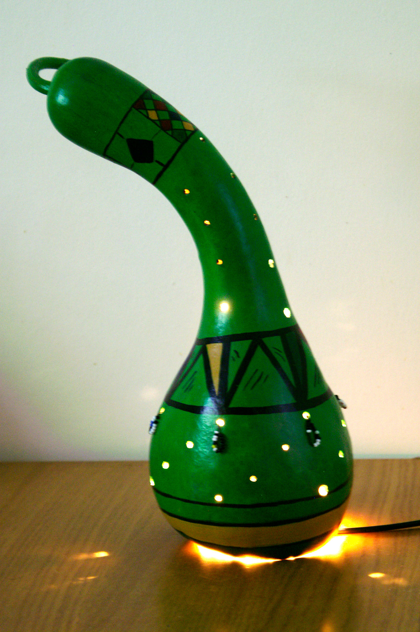 Εδώ είναι μερικές νεροκολοκύθες που, αφού διακοσμήθηκαν, έγιναν φωτιστικά, με την προσθήκη ενός ντουί και με μερικές τρύπες για να βγαίνει το φως.