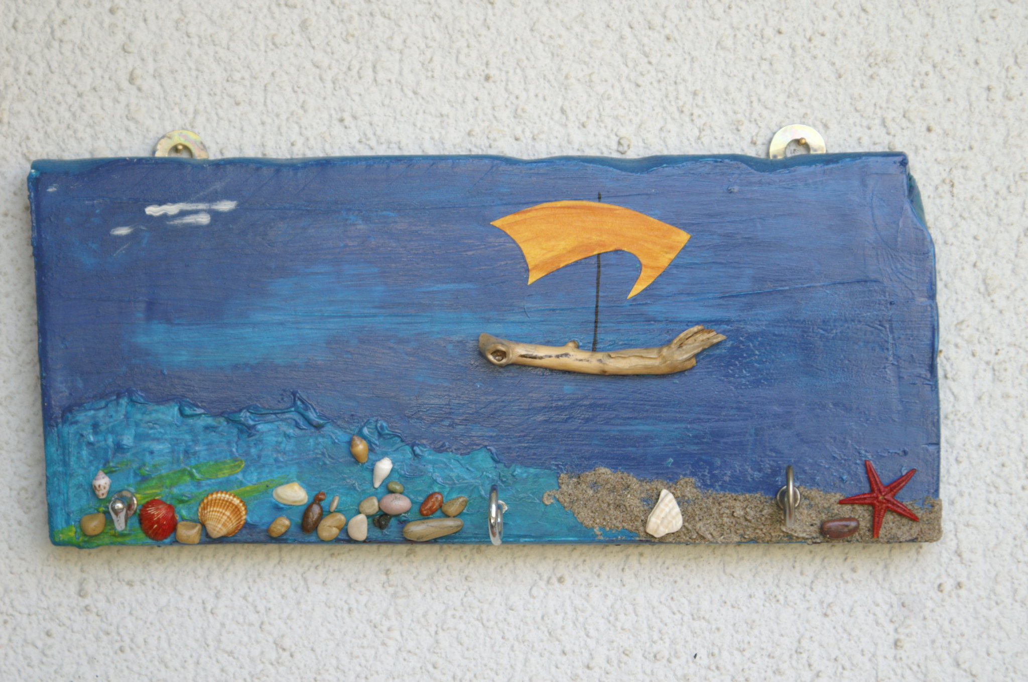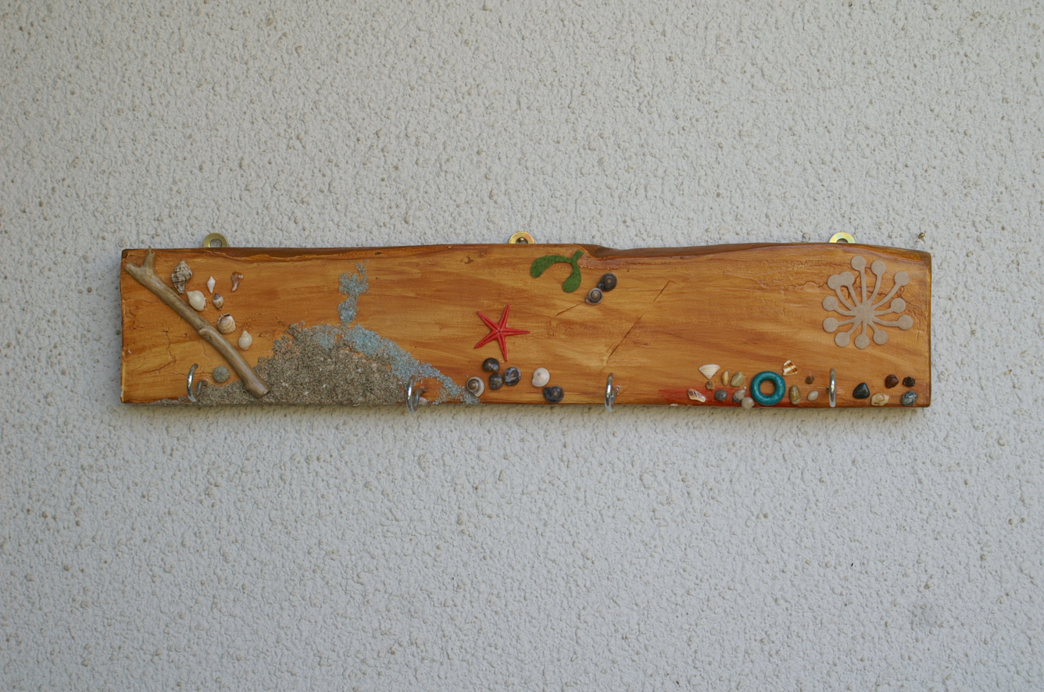 Μερικές σανίδες που είχε ξεβράσει η θάλασσα αποτέλεσαν τη βάση για καινούριες κρεμάστρες, αυτή τη φορά πιο λεπτές και φθαρμένες από τη φύση (και όχι τεχνητά όπως οι προηγούμενες)